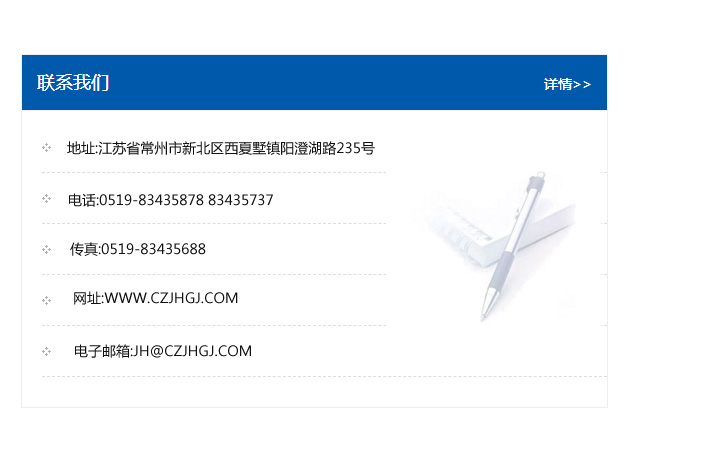 地址:常州市新北區(qū)友邦商務(wù)大廈1幢16、17層  電話(huà):0519-85101652  傳真:0519-85112595  郵編:213022  網(wǎng)址:www.cz-jiayue_cn.zhengji369.com  郵箱:xiajifengaa@163.com